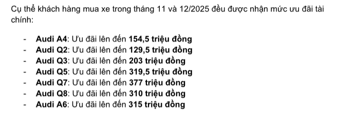 Cụ thể, các mẫu xe Audi nhận ưu đãi trong hai tháng cuối năm 2025 gồm: A4, Q2, Q3, Q5, Q7, Q8 và A6. Trong đó, khách hàng mua Audi Q7 sẽ hưởng giá trị ưu đãi cao nhất lên tới 377 triệu đồng.