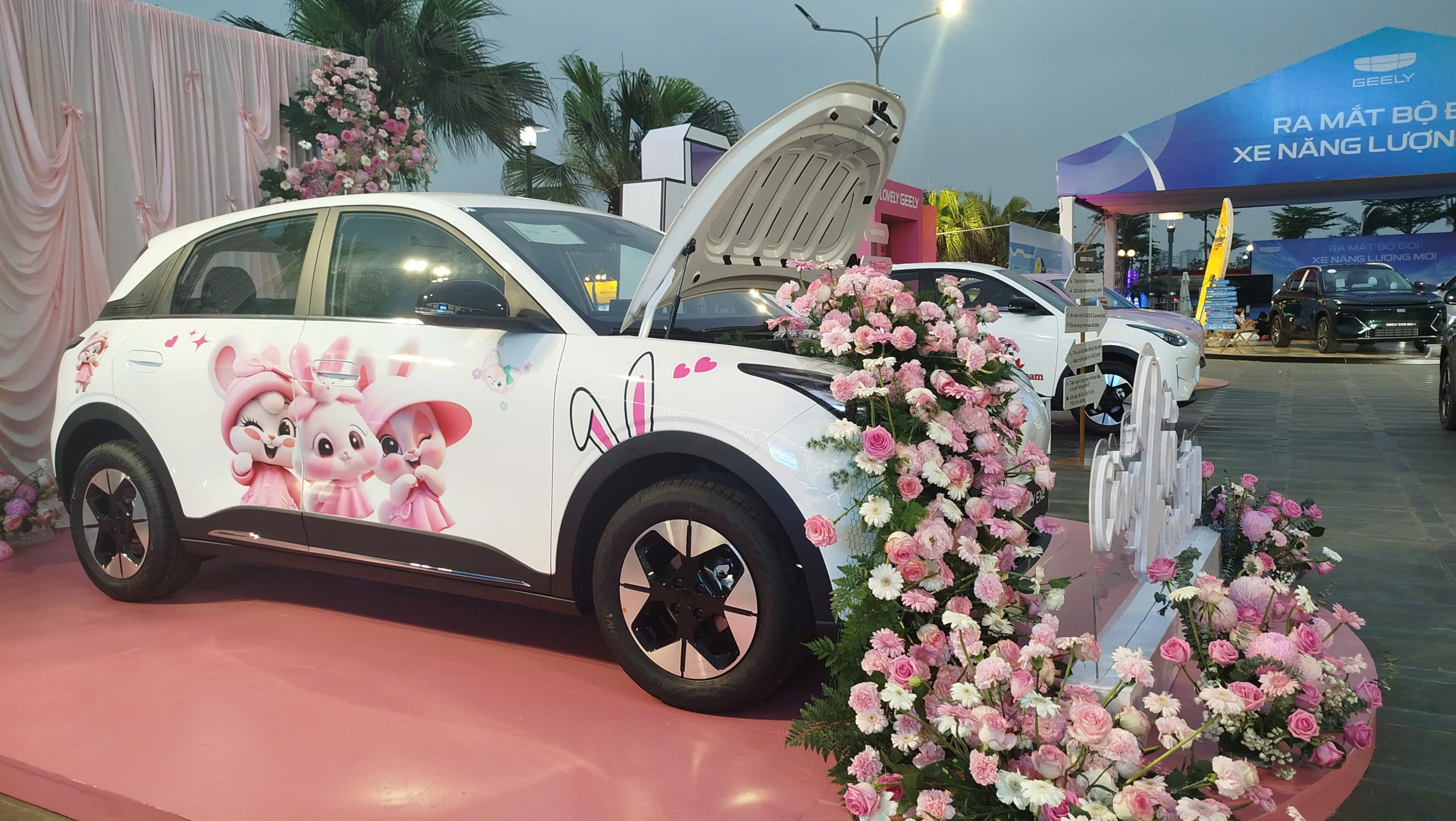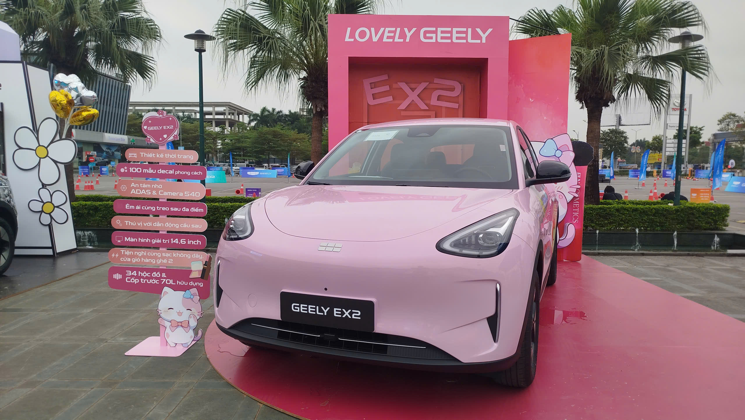 Với mẫu xe điện đô thị cỡ nhỏ Geely EX2, đây là xe thuần điện trên nền tảng GEA của Geely và là mẫu xe độc đáo với trang bị hệ dẫn động cầu sau kết hợp treo sau đa liên kết, với kích thước 4.135 x 1.805 x 1.580mm (dài, rộng, cao) đi kèm vành hợp kim 15 hoặc 16 inch (tuỳ phiên bản), cốp trước dung tích 70 lít và bán kính quay vòng tối thiểu 4,95 m khá linh hoạt trong đô thị. Mẫu xe này còn có tới 100 mẫu tem decal trang trí cho khách chọn cho xe.
