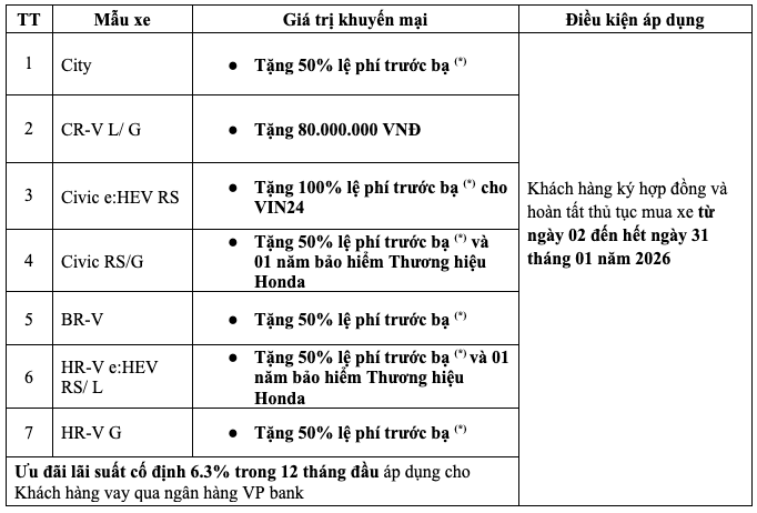Với mong muốn mang đến nhiều hơn nữa cơ hội trải nghiệm các mẫu xe ô tô Honda cho Khách hàng, Honda Việt Nam (HVN) phối hợp tiếp tục triển khai tháng tri ân với khuyến mại cực lớn dành cho các mẫu xe ô tô. Từ ngày 02 tháng 01 đến hết ngày 31 tháng 01 năm 2026. Nhiều mẫu xe được tặng phí trước bạ, ưu đãi lãi vay, riêng hai phiên bản Honda CR-V L/G được tặng tiền mặt với mức 80 triệu đồng.