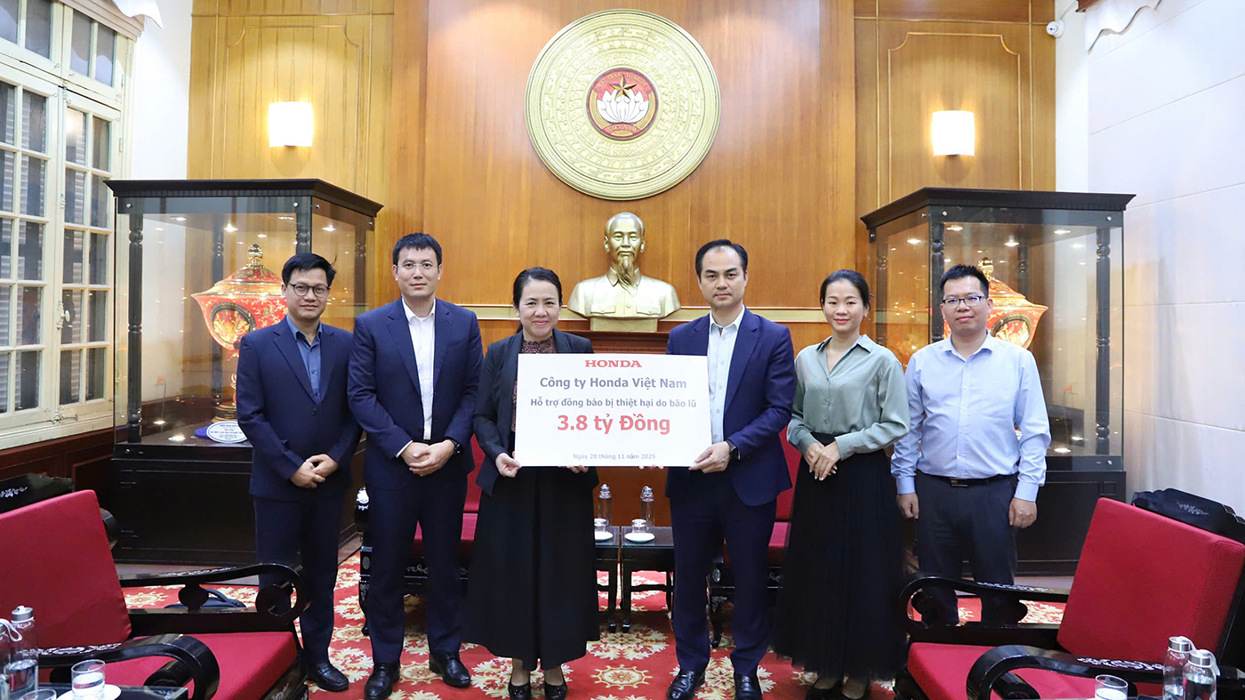 Chia sẻ những khó khăn, mất mát và thiệt hại nặng nề mà người dân các tỉnh đang phải gánh chịu do mưa lũ trong thời gian qua, chiều ngày 28/11/2025, tại trụ sở Ủy ban Trung ương Mặt trận Tổ quốc Việt Nam, bà Đỗ Thu Hoàng – Phó Tổng Giám đốc thứ nhất Honda Việt Nam đã đại diện công ty ủng hộ 3,8 tỷ đồng thông qua Ủy ban Trung ương Mặt trận Tổ quốc Việt Nam.