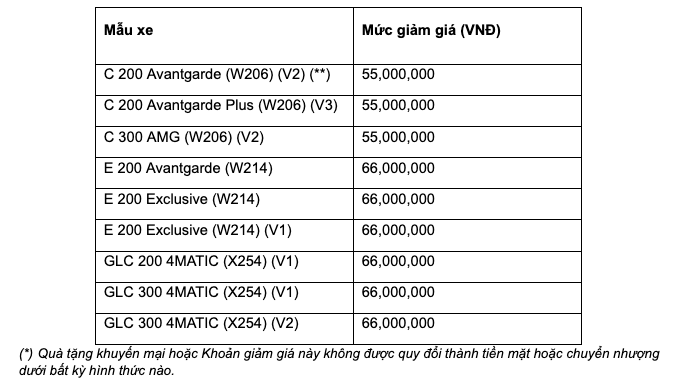 Các mẫu xe hạng sang của Mercedes-Benz tại Việt Nam được nhận các gói khuyến mại bao gồm C-Class, GLC và E 200, với hai lựa chọn là giảm giá hoặc các gói bảo hiểm xe cơ giới. Các mẫu xe thuần điện cũng được hỗ trợ khuyến mại trong dịp này, bao gồm EQB và EQS, hay EQE SUV, EQS SUV, Maybach EQS SUV.