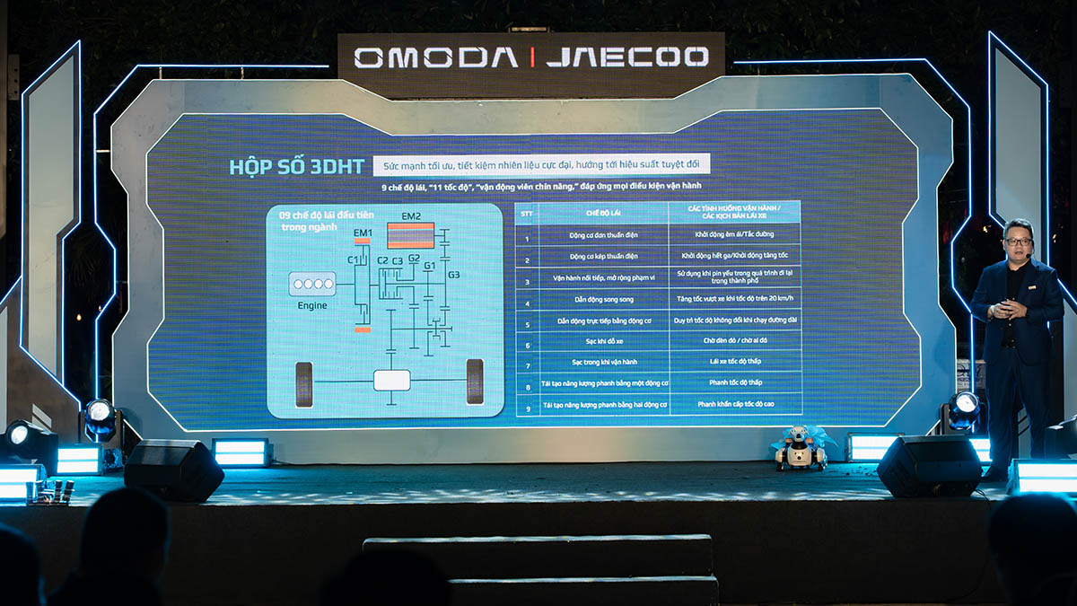 Một trong những điểm nhấn quan trọng trong kế hoạch phát triển 2026 là việc Omoda & Jaecoo Việt Nam đưa công nghệ hybrid tân tiến hàng đầu thế giới vào danh mục sản phẩm - công nghệ Super Hybrid – 3 DHT. Điểm nổi trội của công nghệ này gồm 2 động cơ điện và 3 bộ ly hợp, hai động cơ có thể hoạt động độc lập hoặc cùng lúc, đồng thời phát điện, tự động lựa chọn giải pháp tối ưu dựa trên nhu cầu vận hành khác nhau. Động cơ xăng có thể tham gia dẫn động từ tốc độ 20 km/h. Ở cấp số 3, hai động cơ điện và động cơ xăng dẫn động đồng thời. Ở tốc độ không đổi 120 km/h, vòng tua động cơ chỉ 2.290 vòng/phút, cải thiện hiệu suất nhiên liệu hơn 50% so với xe xăng truyền thống.