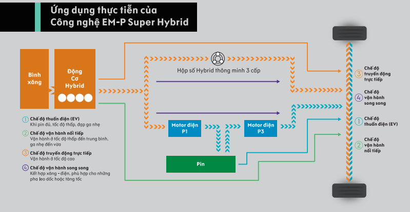 Công nghệ PHEV với tên gọi EM-P Super Hybrid, gồm động cơ xăng 1.5L tăng áp kết hợp với mô tơ điện kép cùng hộp số Hybrid 3 cấp 3DHT Evo và hệ dẫn động cầu trước; hệ thống này mang đến tổng công suất tối đa 345 mã lực và mô-men xoắn cực đại 580 Nm, cho khả năng tăng tốc 0-100 km/h trong 6,75 giây. Mức tiêu thụ nhiên liệu hỗn hợp được hãng công bố đạt 1,38 lít/100 km.