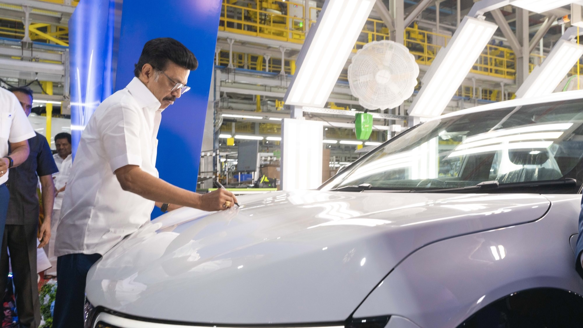 Thủ hiến bang Tamil Nadu - Ông M.K. Stalin - ký tặng lên chiếc ô tô điện đầu tiên xuất xưởng từ nhà máy VinFast ở Tamil Nadu (Ấn Độ).